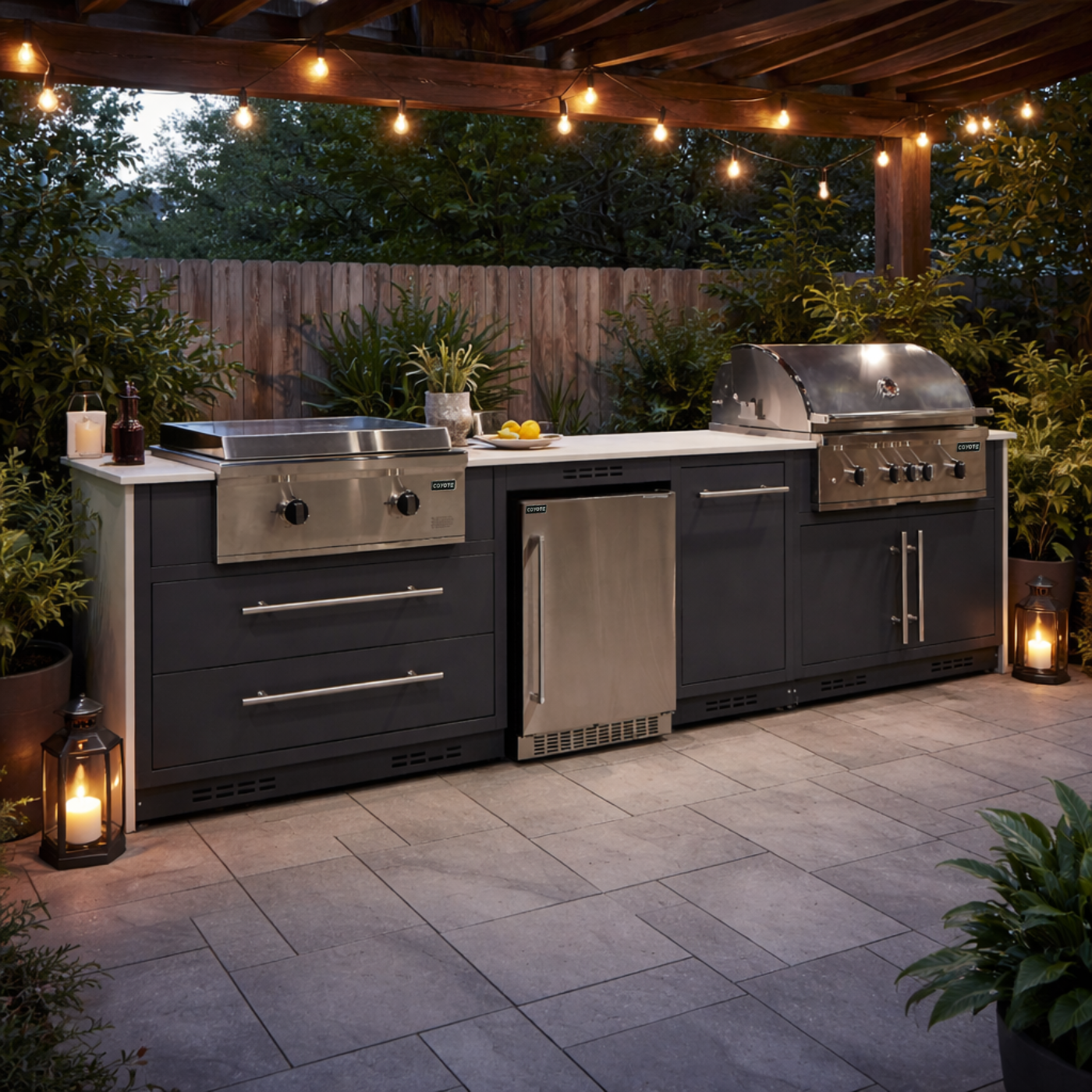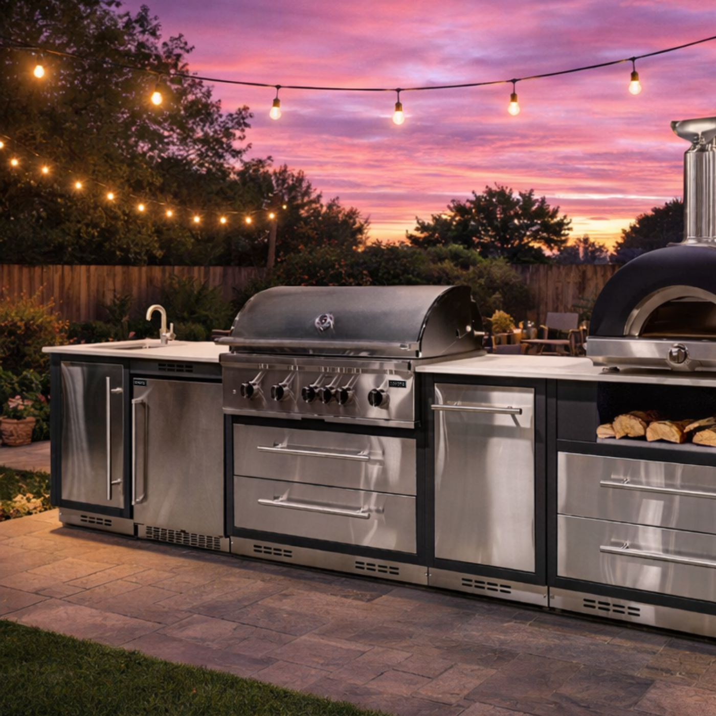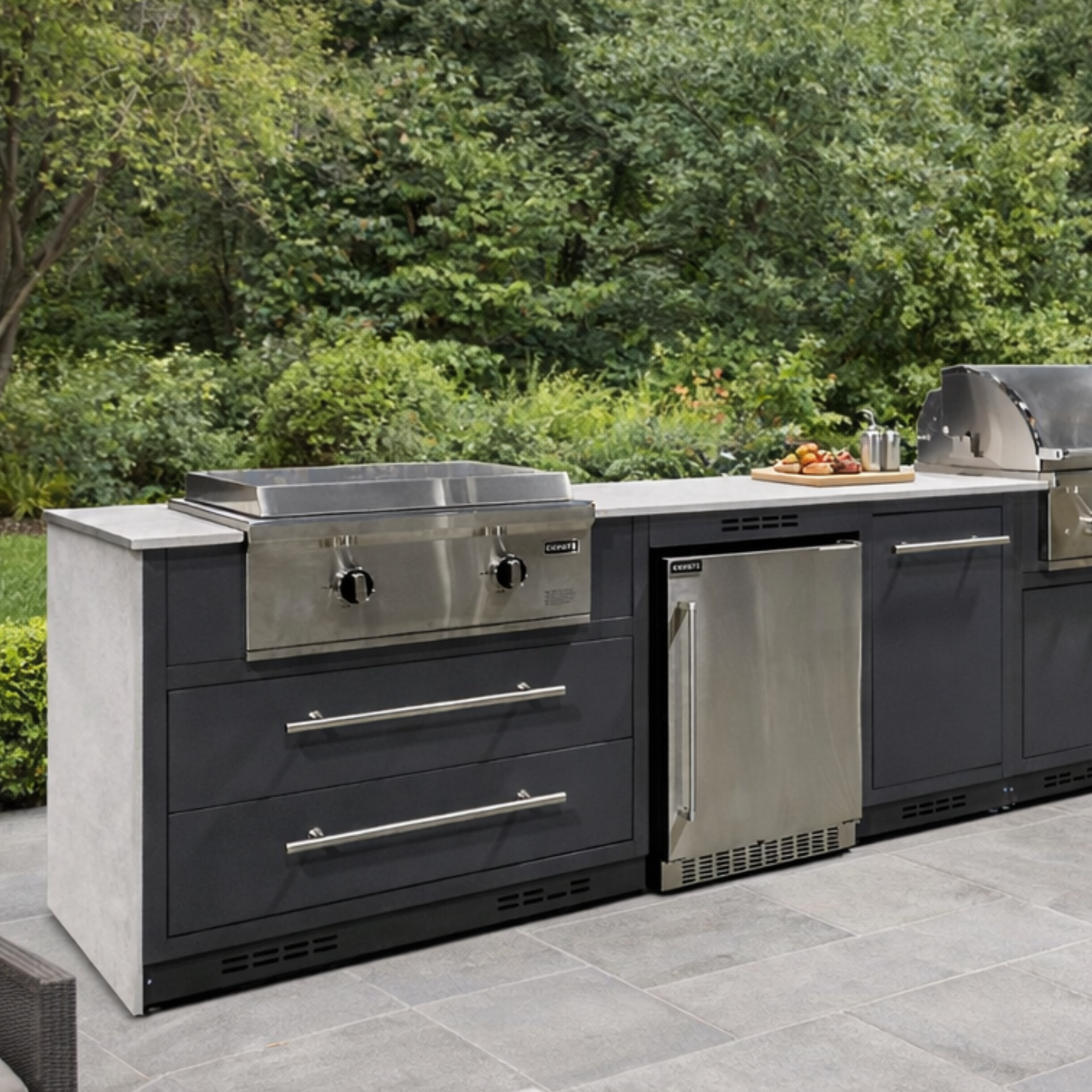Our modular outdoor kitchen cabinet system offers true storage capacity and a custom-built look, without the complexity, cost, or lead times of traditional outdoor kitchens.