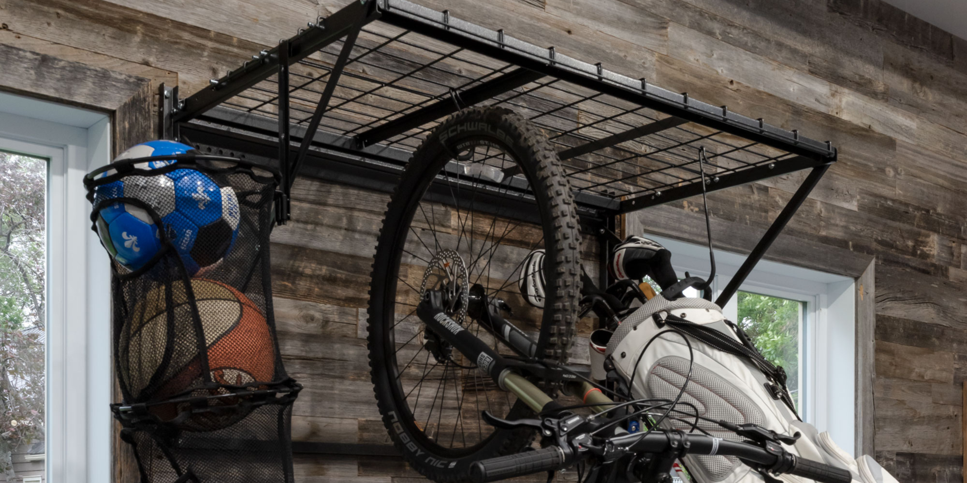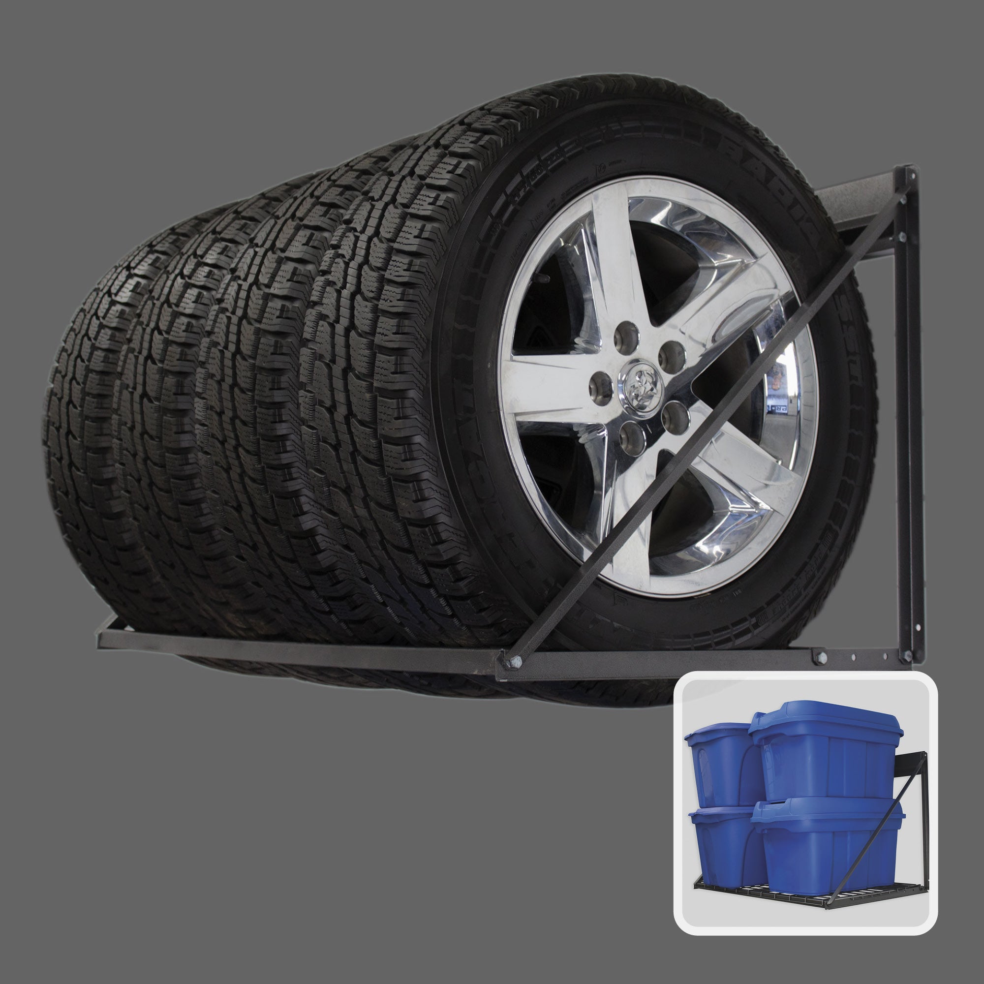 If you are looking for a simple tire storage solution, our wall mounted tire rack supports up to 4 tires, 11.5 in. wide, max 400  lb. ProRack can also be assembled with the shelf at the bottom of support bars.